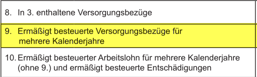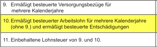 "Ermäßigt besteuerter Arbeitslohn für mehrere Kalenderjahre (ohne 9.) und ermäßigt besteuerte Entschädigungen."
