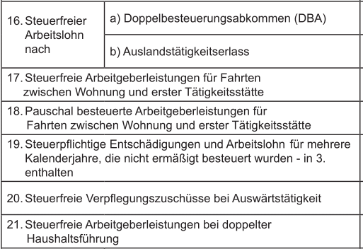 Zeile 16 bis 21 anzeigen(u.a. steuerfreie Fahrtkosten, Lohn nach DBA)