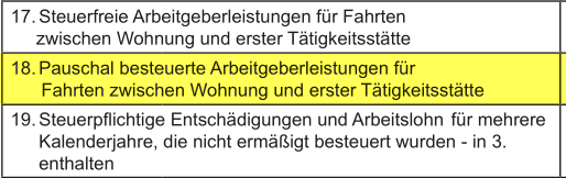 - Pauschalbesteuerte Erstattungen für Fahrtkosten (Zeile 18)