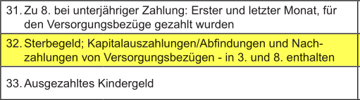 Separat zu erfassen sind einmalige Versorgungsbezüge in Sonderfällen, wie Sterbegeld oder Kapitalabfindungen. Diese geben Sie in Zeile 32 an.