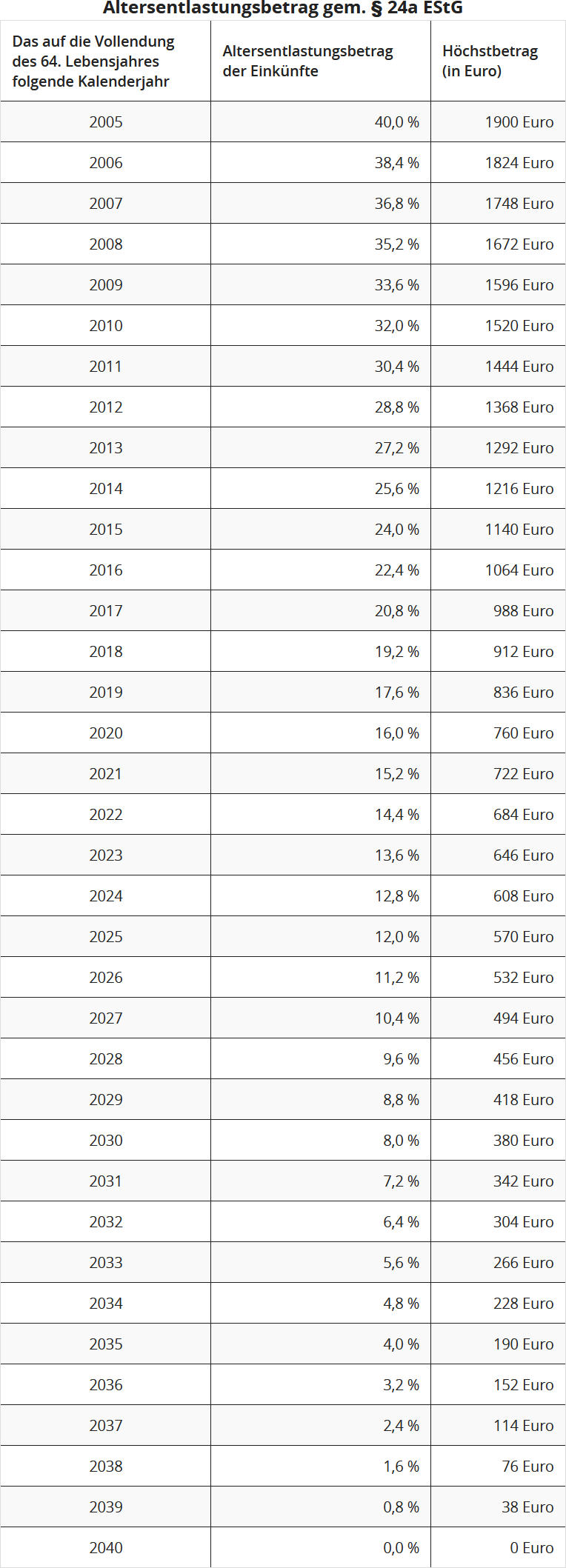 Die maßgebenden Prozentsätze und Höchstbeträge für den Altersentlastungsbetrag sind abhängig vom Kalenderjahr, das auf die Vollendung des 64. Lebensjahres folgt. Die so ermittelten Beträge bleiben dann lebenslang festgeschrieben.