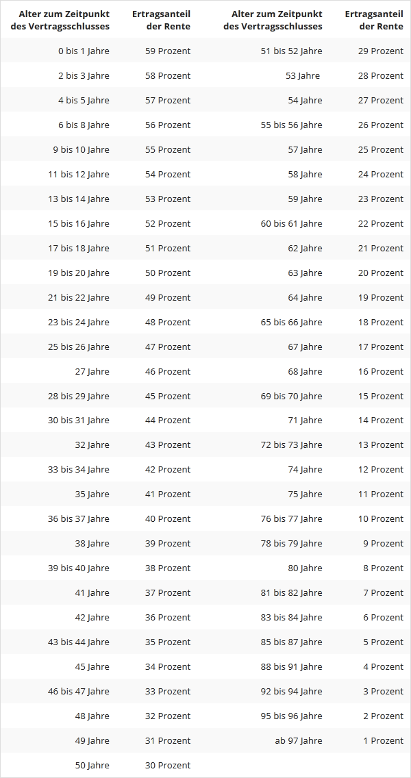 Die Höhe des Ertragsanteils richtet sich nach dem Alter des Rentenberechtigten bei Beginn der Rente (§ 22 Nr. 1 Satz 3 EStG). In der folgenden Übersicht finden Sie die Höhe des Ertragsanteils je nach Alter bei Beginn der Rente: