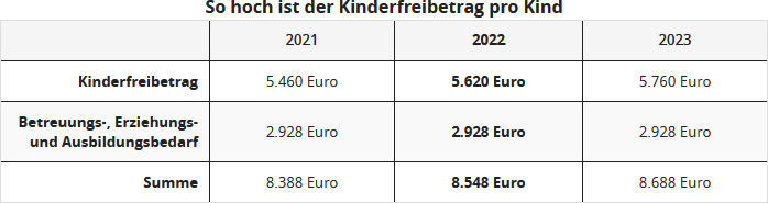 Der jährliche Kinderfreibetrag liegt im Jahre 2022 für Eltern, die steuerlich zusammen veranlagt werden, bei 5.620 Euro, der BEA-Freibetrag (für Betreuung, Erziehung und Ausbildung) bei 2.928 Euro. So steht Eltern für das Steuerjahr 2022 ein Freibetrag von insgesamt 8.548 Euro je Kind zu. Für getrennt Veranlagte bzw. Alleinstehende gilt, dass jeder Elternteil jeweils Anspruch auf den halben Freibetrag hat.