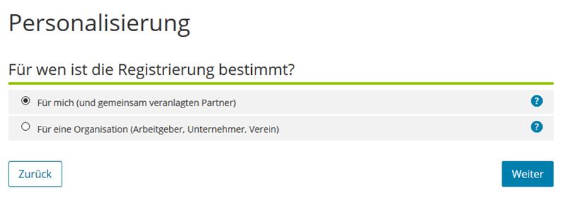 Wähle zuerst im Punkt Personalisierung die Option "Für mich (und gemeinsam veranlagten Partner)" und klicke dann auf "Weiter". Diese Registrierung ist für Privatpersonen aber auch Einzelunternehmer und Besitzer einer Photovoltaikanlage passend, die mit dem Zertifikat ihre Steuererklärung abgeben wollen.
