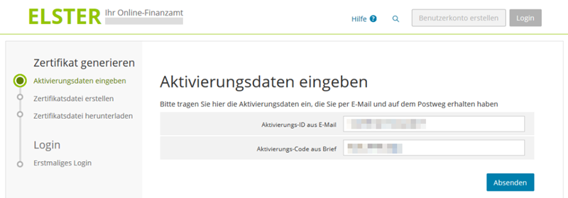 Du hast Schritt 1 der Registrierung bereits durchgeführt und eine E-Mail mit Aktivierungs-ID und einen Brief mit Aktivierungs-Code erhalten. In diesem Schritt aktivierst du mit diesen Daten deinen Zugang. Du erhältst nach der Eingabe der Aktivierungsdaten eine durch ein eigenes persönliches Passwort geschützte Zertifikatsdatei (Dateiendung "*.pfx"), mit der du zukünftig dein Login durchführen kannst.