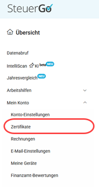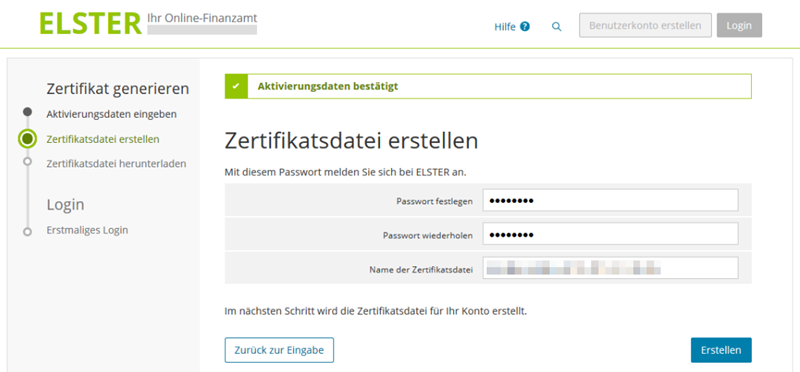 Für die Online-Abgabe mit eigenem Zertifikat ist die Erstellung einer Zertifikatsdatei erforderlich. Rufe hierzu den Registrierungsassistenten Deines Online-Finanzamts auf.