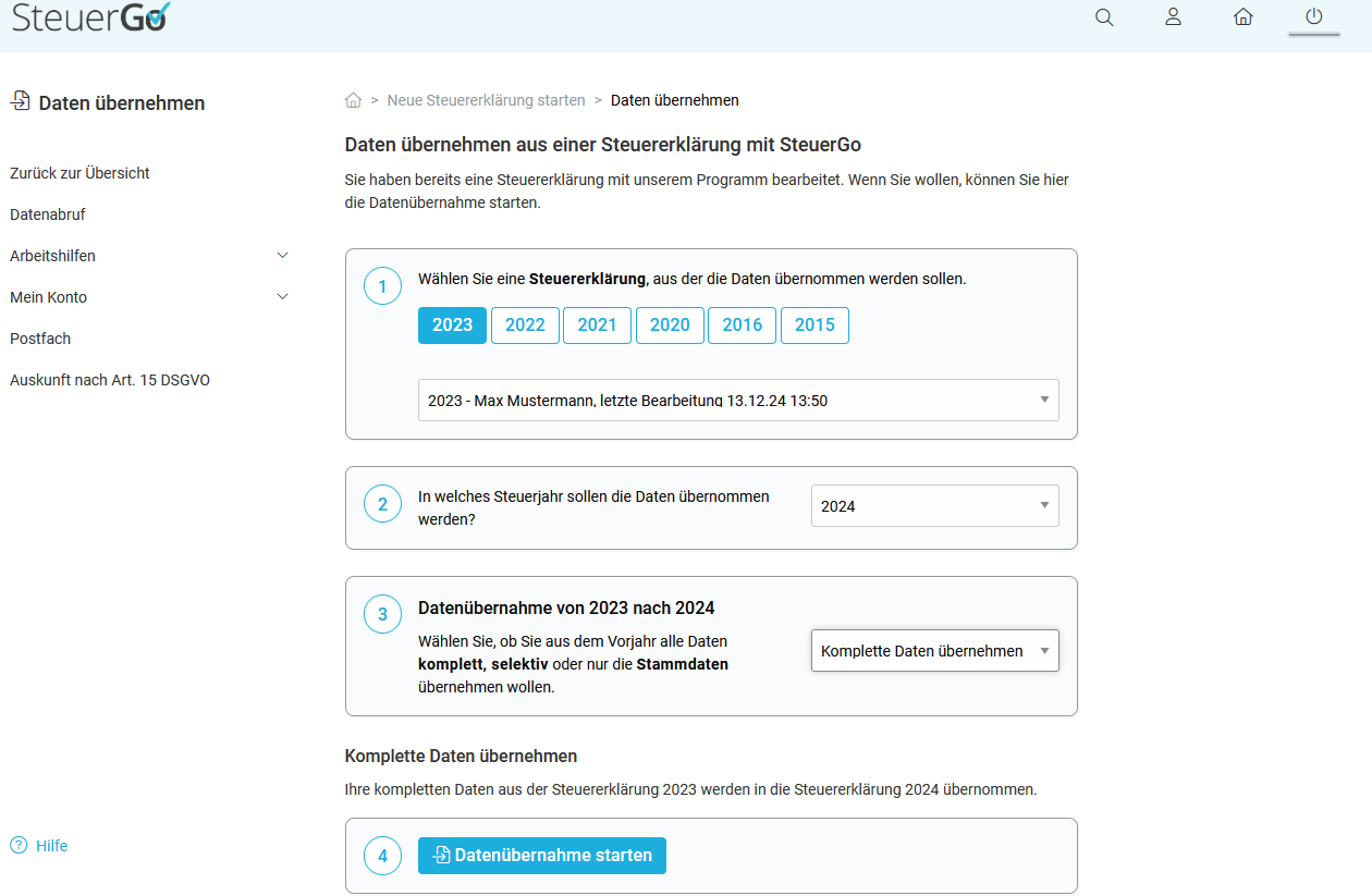 Wenn du die Daten aus 2022 beispielsweise nach 2024 übernehmen willst, musst du zuerst eine Steuererklärung für 2023 mit den Daten aus 2022 erstellen. Anschließend kannst du die Datenübernahme von 2023 nach 2024 vornehmen.