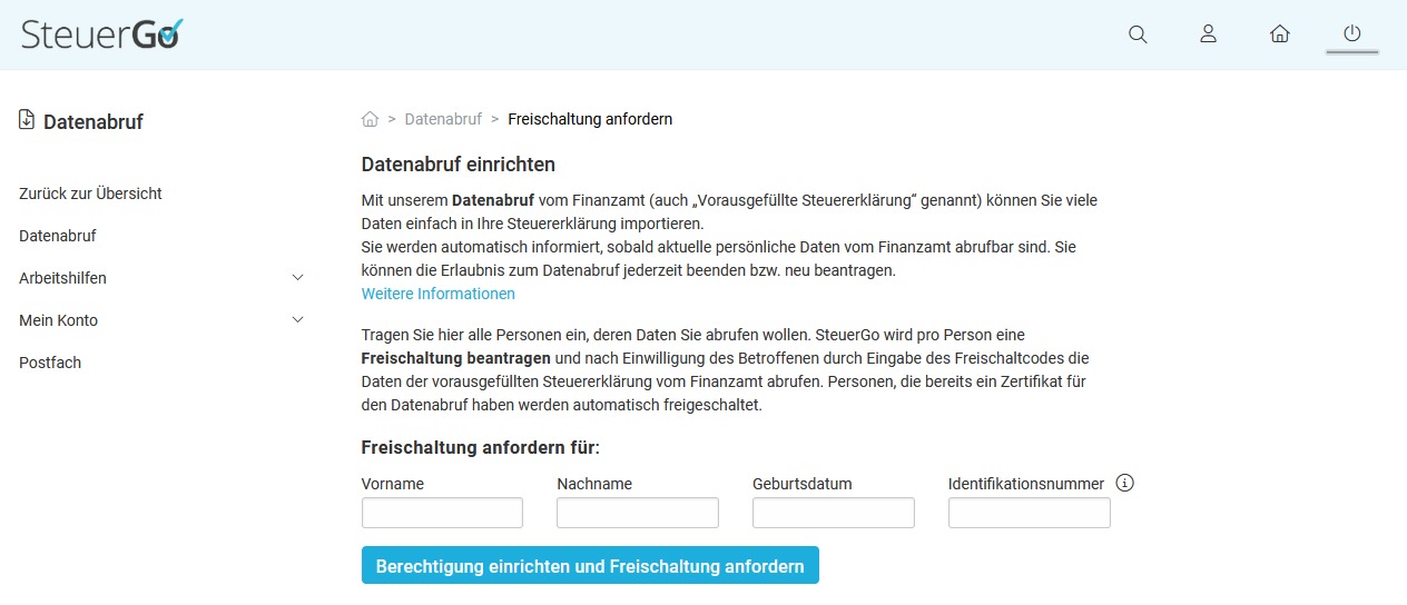 Der Datenabruf ist ein Serviceangebot von SteuerGo. Über den Datenabruf kannst du personenbezogene Daten, die bei deinem Finanzamt über dich gespeichert sind, abrufen und direkt in deine Steuererklärung importieren. Die Finanzverwaltung bezeichnet die bereitgestellten Daten auch als "vorausgefüllte Steuererklärung" (kurz: VaSt). (Weitere Informationen unter: Was ist der elektronische Datenabruf?)