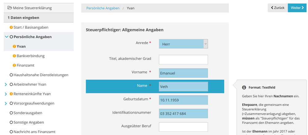 Alle Eingabefelder, die mit Daten aus dem elektronischen Datenabruf in deine Steuererklärung befüllt wurden, sind beim ersten Aufruf farblich (gelb) gekennzeichnet. So kannst du die übernommenen Daten schnell erkennen und diese einfach überprüfen.