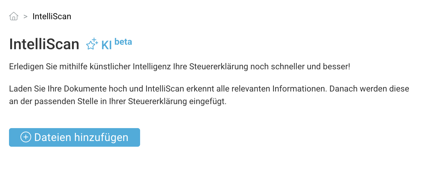 Die Nutzung von IntelliScan ist für dich immer kostenlos: Du kannst Dateien hochladen und Daten automatisch importieren und in deine Steuererklärung einfügen lassen — ohne weitere Kosten.