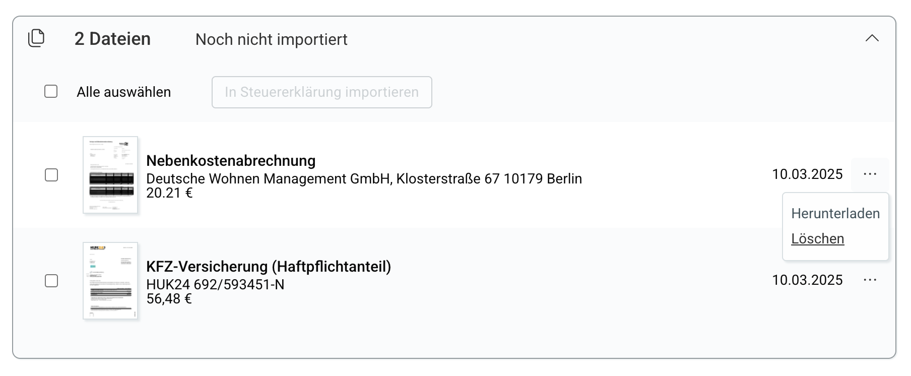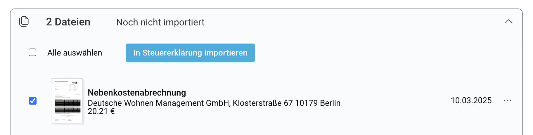 - Stelle sicher, dass die Dateien lesbar (Bildqualität) und steuerlich relevant sind. Du hast sonst auch die Möglichkeit, die Daten manuell in deine Steuererklärung einzugeben.