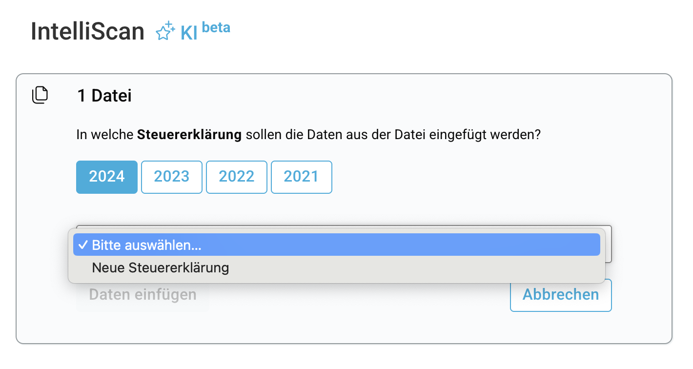 Wähle eine Steuererklärung aus und bestätige mit “Dateien einfügen”. Du kannst hier auch eine neue Steuererklärung starten.