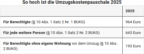 - Zusätzlich zu diesen tatsächlichen Kosten gibt es eine Umzugskostenpauschale (Pauschbetrag für sonstige Umzugsauslagen), für die keine Belege notwendig sind. Eine Tabelle und ausführliche Erklärung stehen im folgenden Abschnitt.