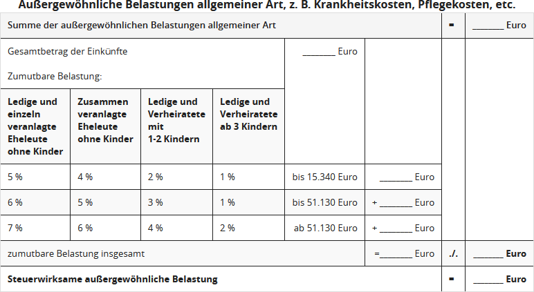 Die Aufwendungen, die als außergewöhnliche Belastungen absetzbar sind, kürzt das Finanzamt um die zumutbare Belastung, so insbesondere Krankheits-, Kur-, Pflege-, Behinderungskosten. Die Zumutbarkeitsgrenze wird in drei Stufen (Stufe 1 bis 15.340 Euro, Stufe 2 bis 51.130 Euro, Stufe 3 über 51.130 Euro) nach einem bestimmten Prozentsatz des "Gesamtbetrags der Einkünfte" bemessen. Diese beträgt je nach Familienstand und Kinderzahl zwischen 1 und 7 %.